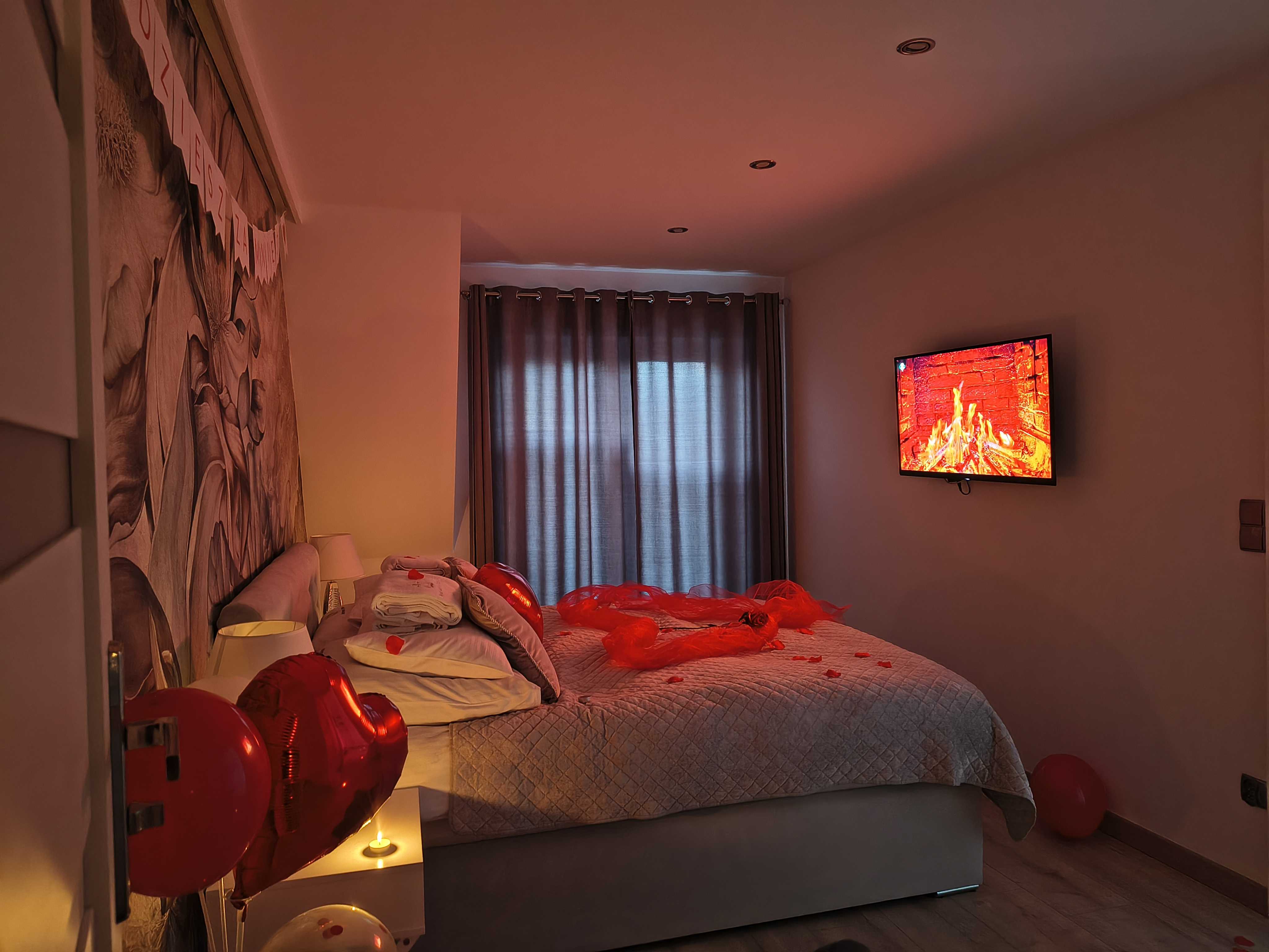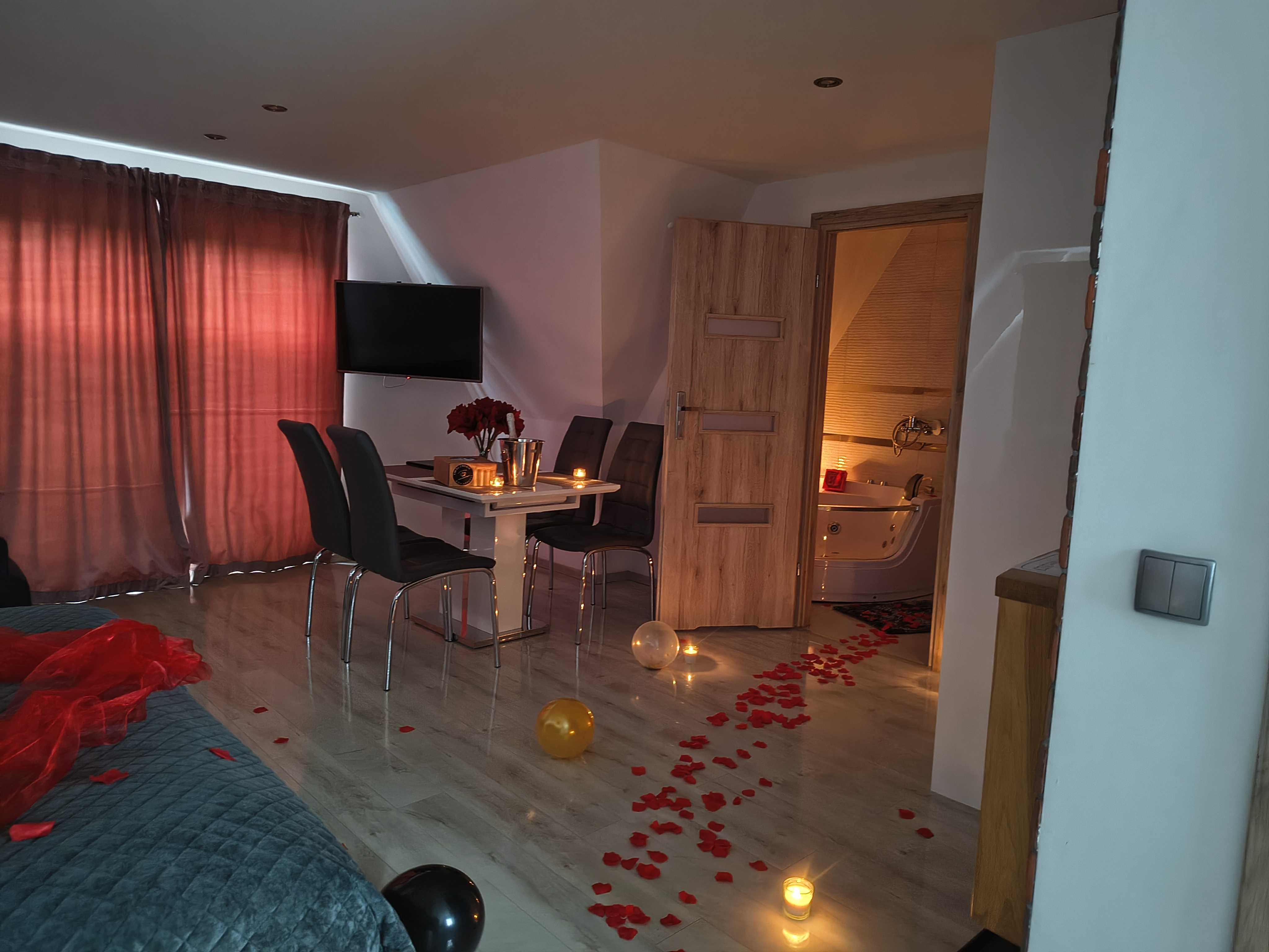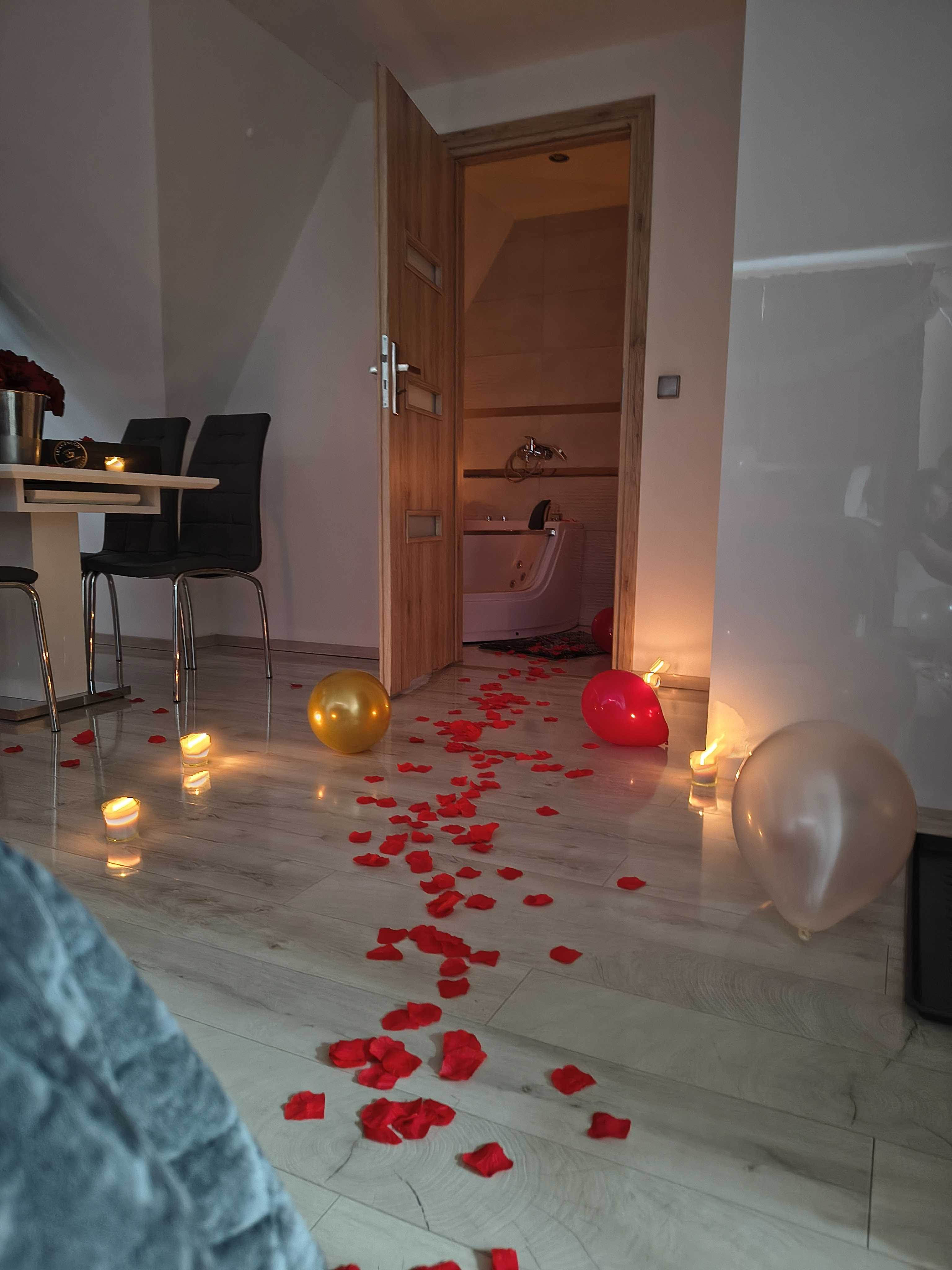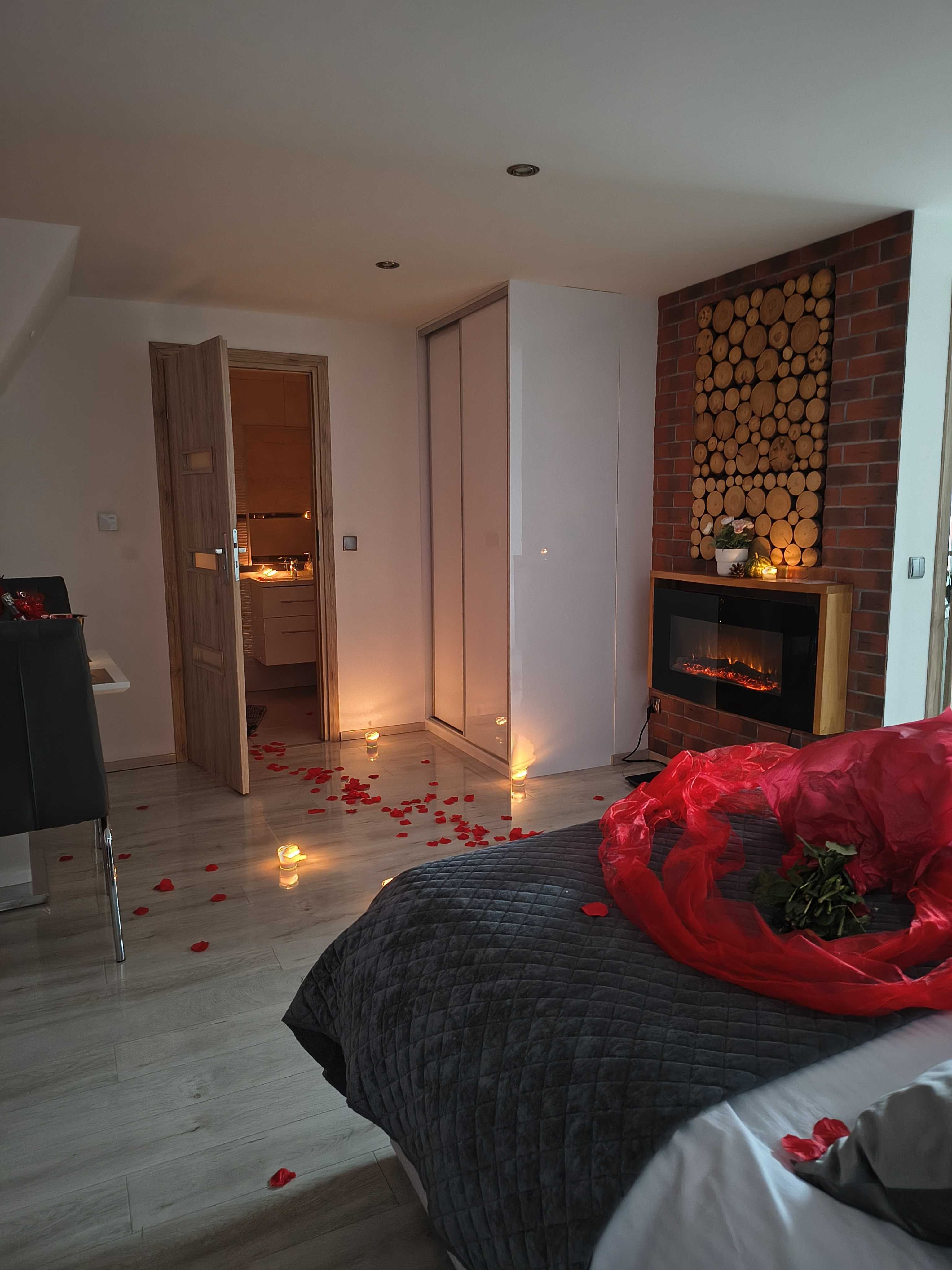 ❤️ Zmysłową dekorację apartamentu – materiałowe płatki róż, delikatne świece oraz serce ułożone na łóżku, tworzące romantyczny klimat od pierwszego kroku.