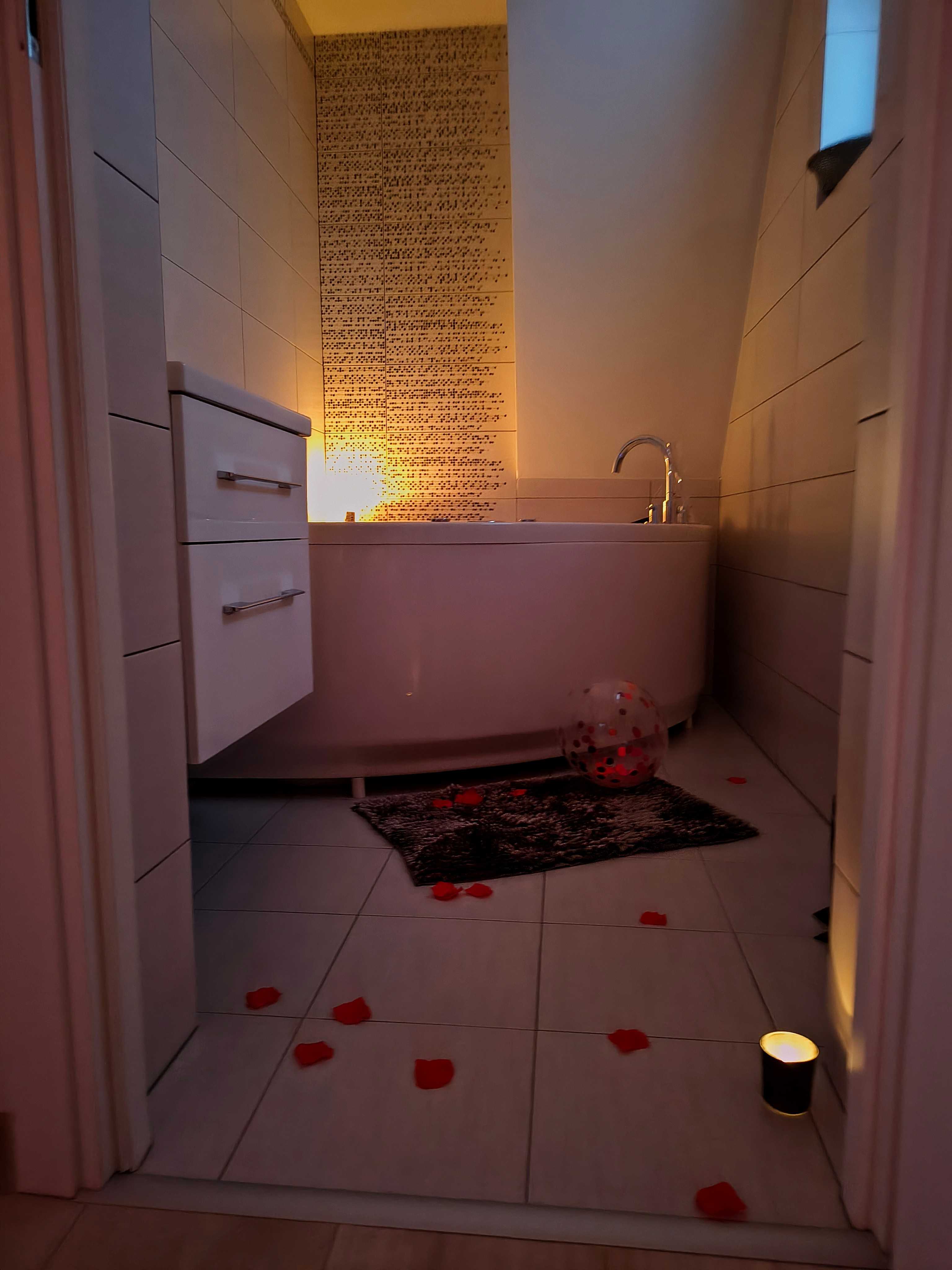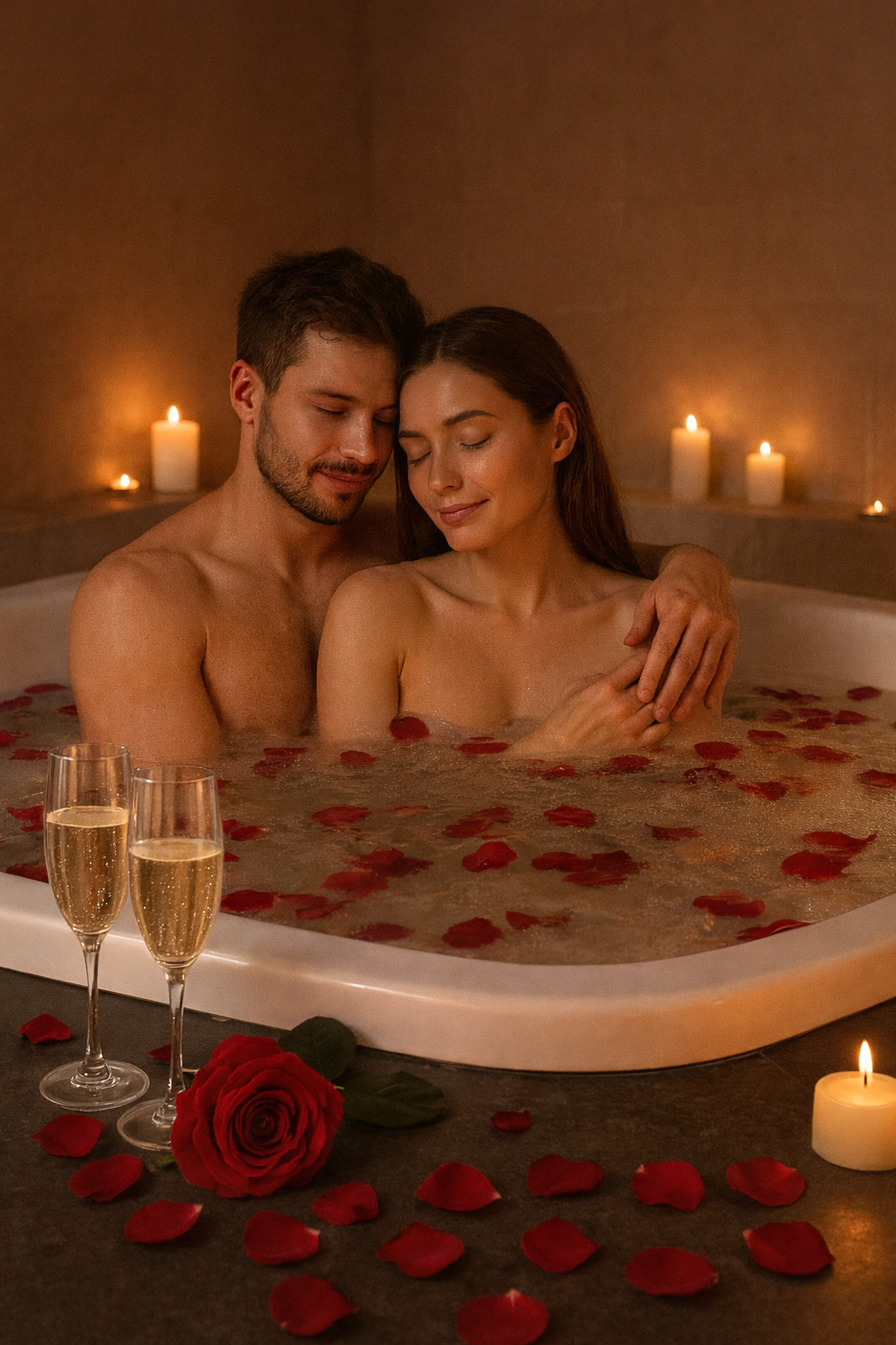 ❤️ Kąpiel w blasku świec w wannie z hydromasażem – z mydlanymi płatkami róż, która pozwoli Wam się odprężyć i celebrować intymne chwile.