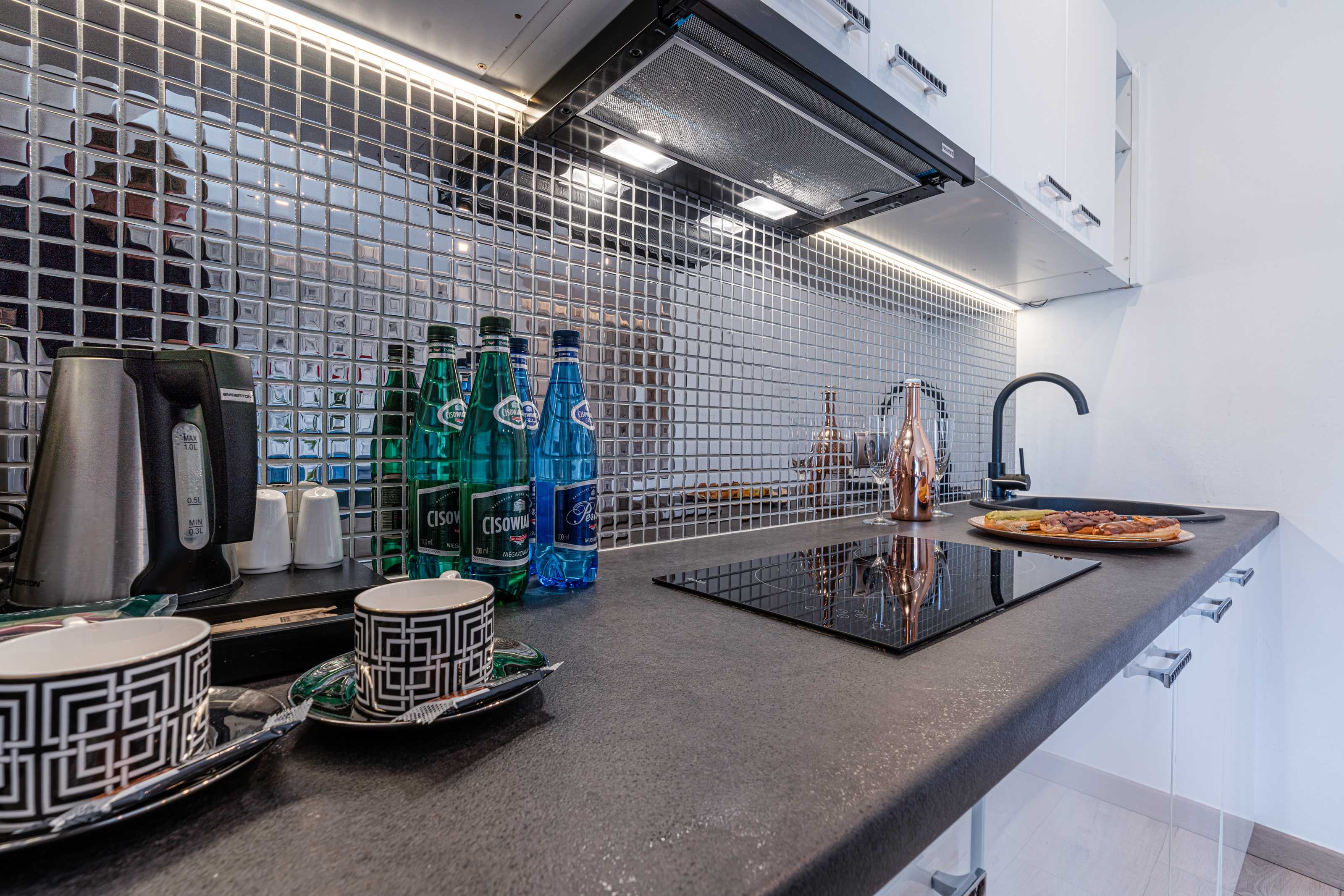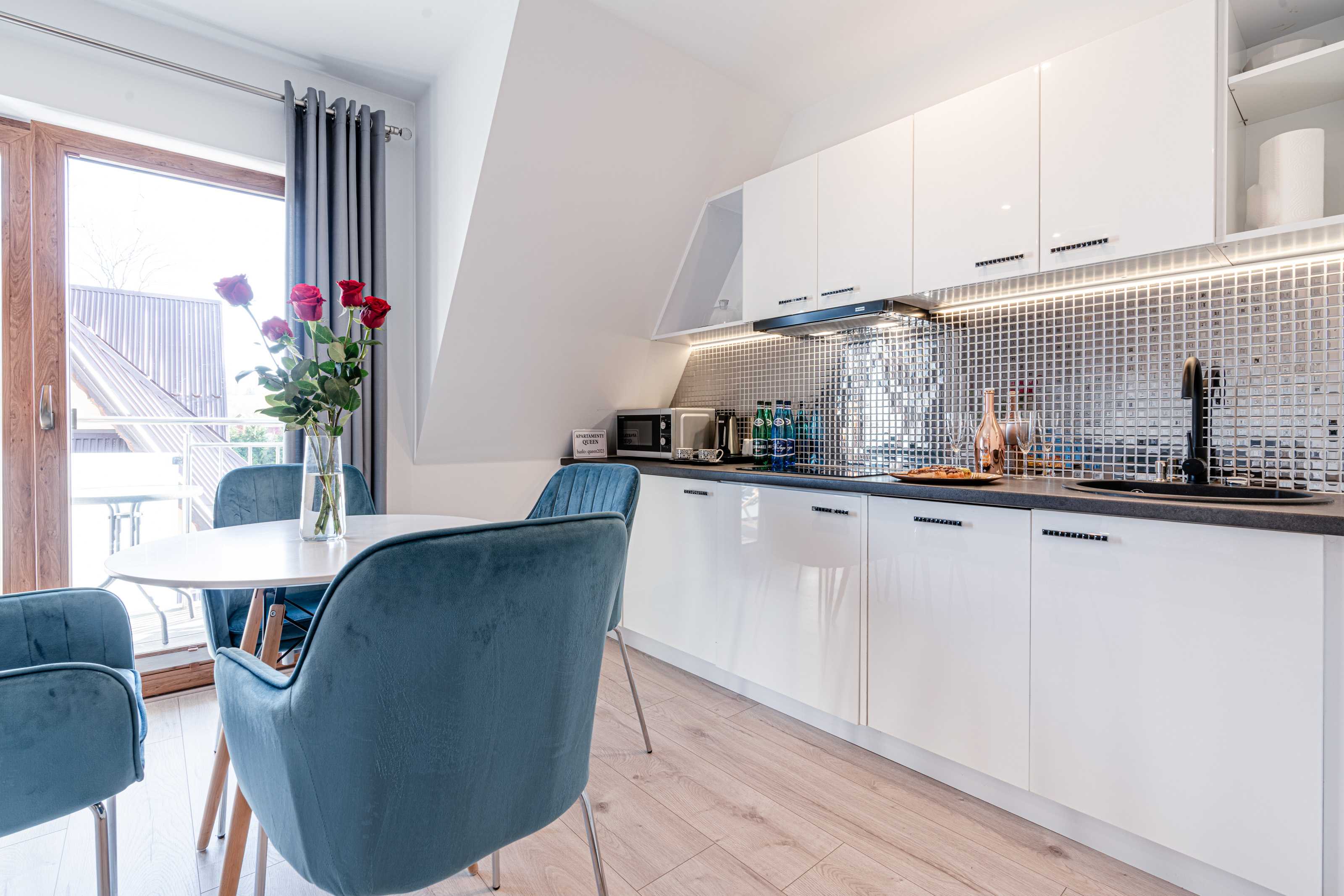 Balkon wyposażony jest w leżaki oraz stolik z krzesłami. Do Państwa dyspozycji oddajemy w pełni wyposażoną kuchnię, w której między innymi dostępne są : ekspres do kawy, mikrofalówka, toster, zmywarka, bezpłatny zestaw do parzenia kawy i herbaty oraz woda mineralna .